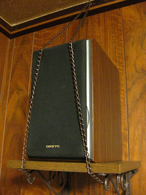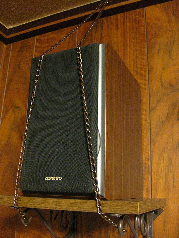そしてもう一つ大事なものがチェーンです、このまま棚にスピーカーを載せて置くと地震の際に落下してしまいます、そこでこのチェーンを使いスピーカーを固定して落下を防止します。