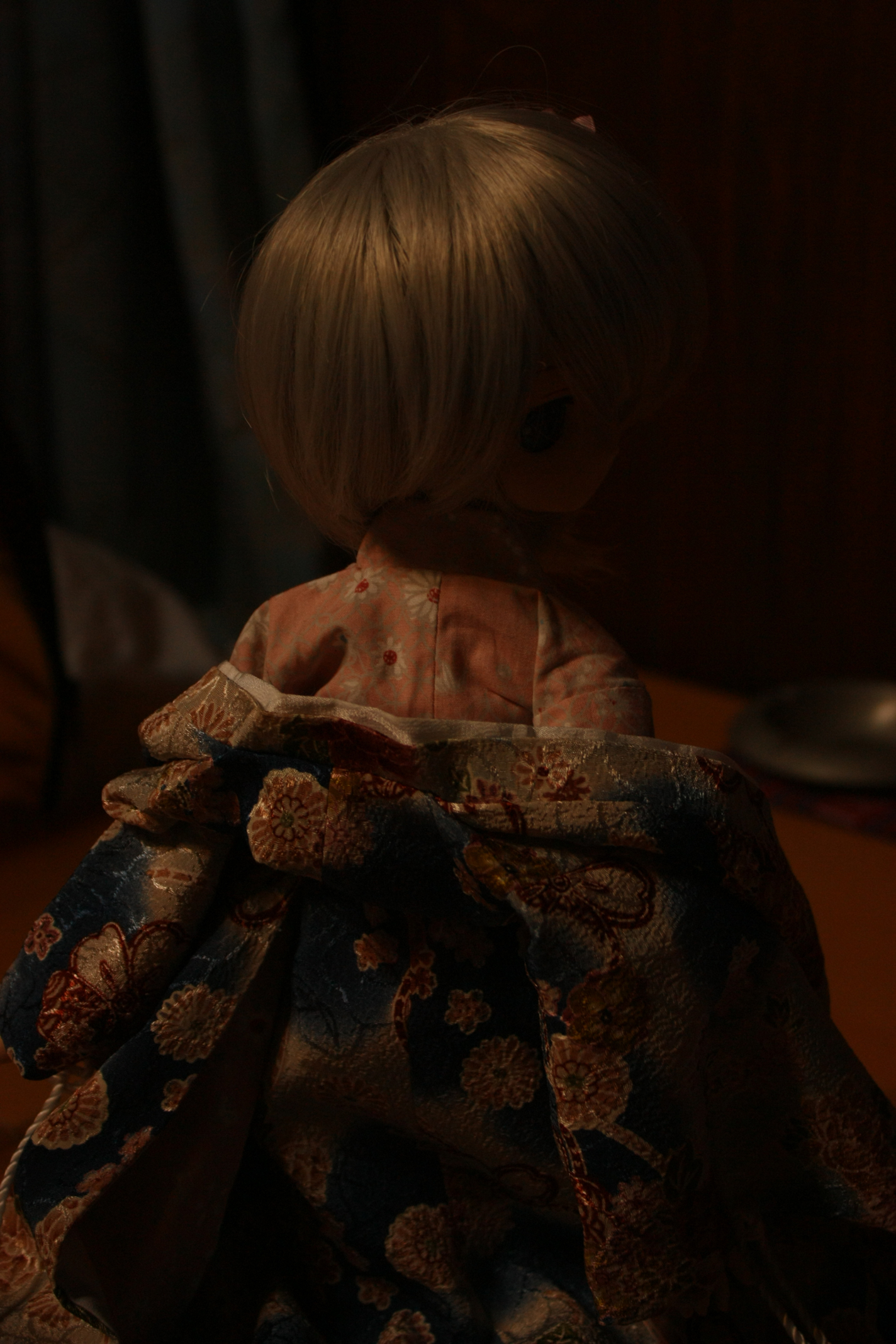 一部ホワイトバランスをとれない状態で照明の効果を試すために撮影をしたのですが後からモニターでホワイトバランスを取るのは時間がかかりすぎて非効率的ですし基準がないのでできあがりの状態がばらついてしまうのは問題です、一部そのときの写真も混じっていますが高めのケルビン値で着物が綺麗な青色になっています。