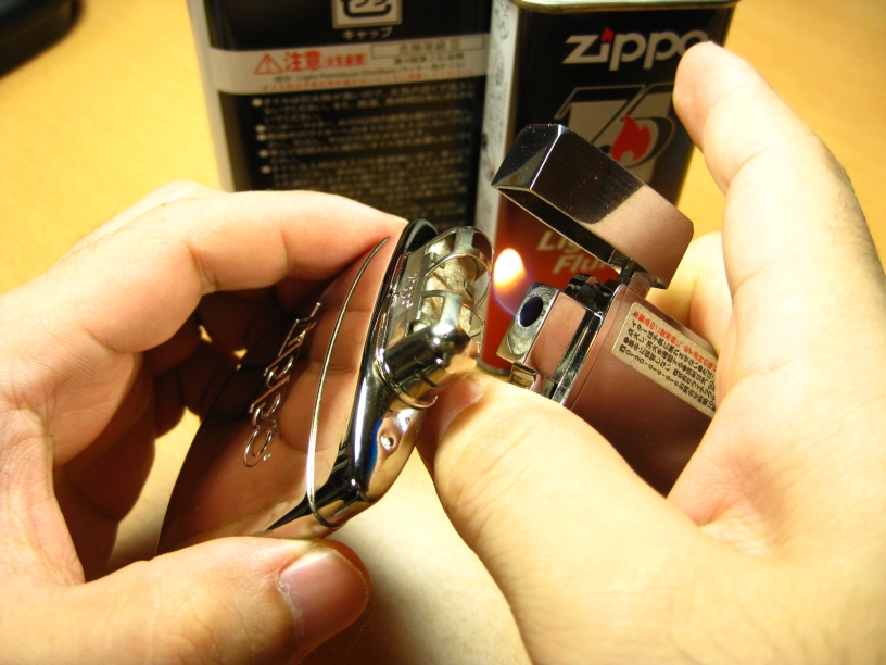 燃料のZIPPOオイルを入れたら火口を取り付け火で3秒程度あぶります、これは発火させているのではなくプラチナ触媒を活性化させるための予熱です。
