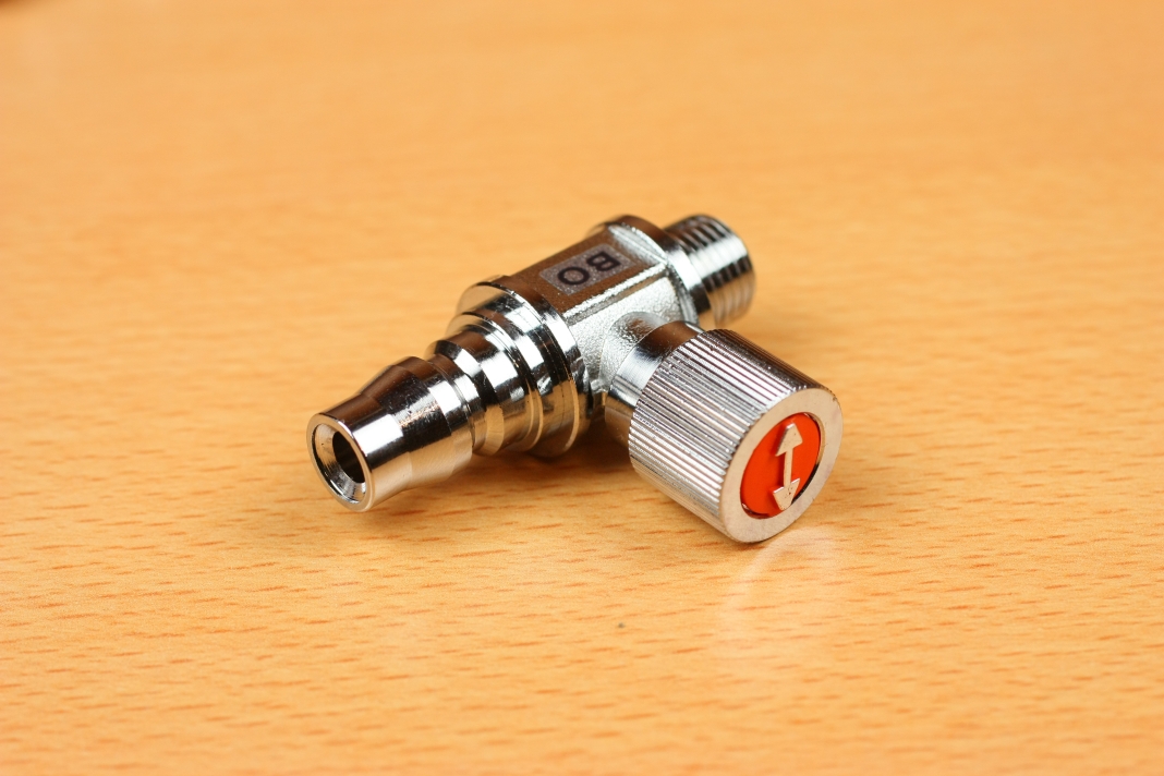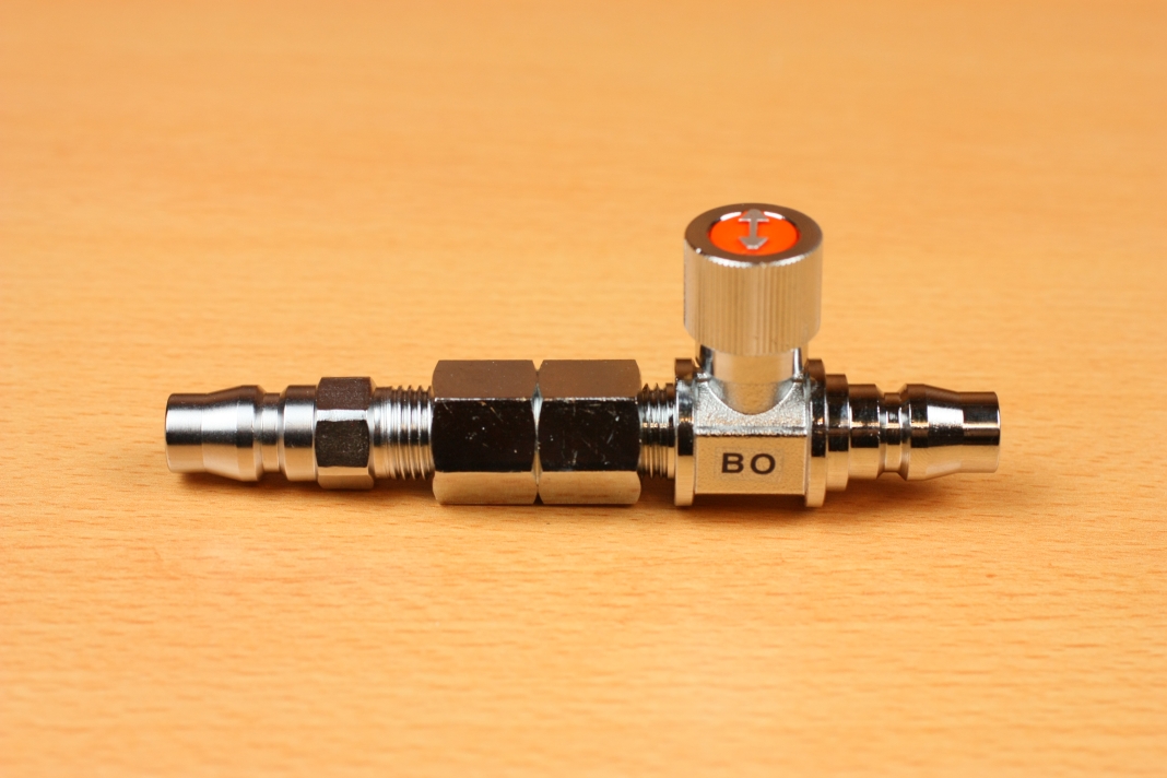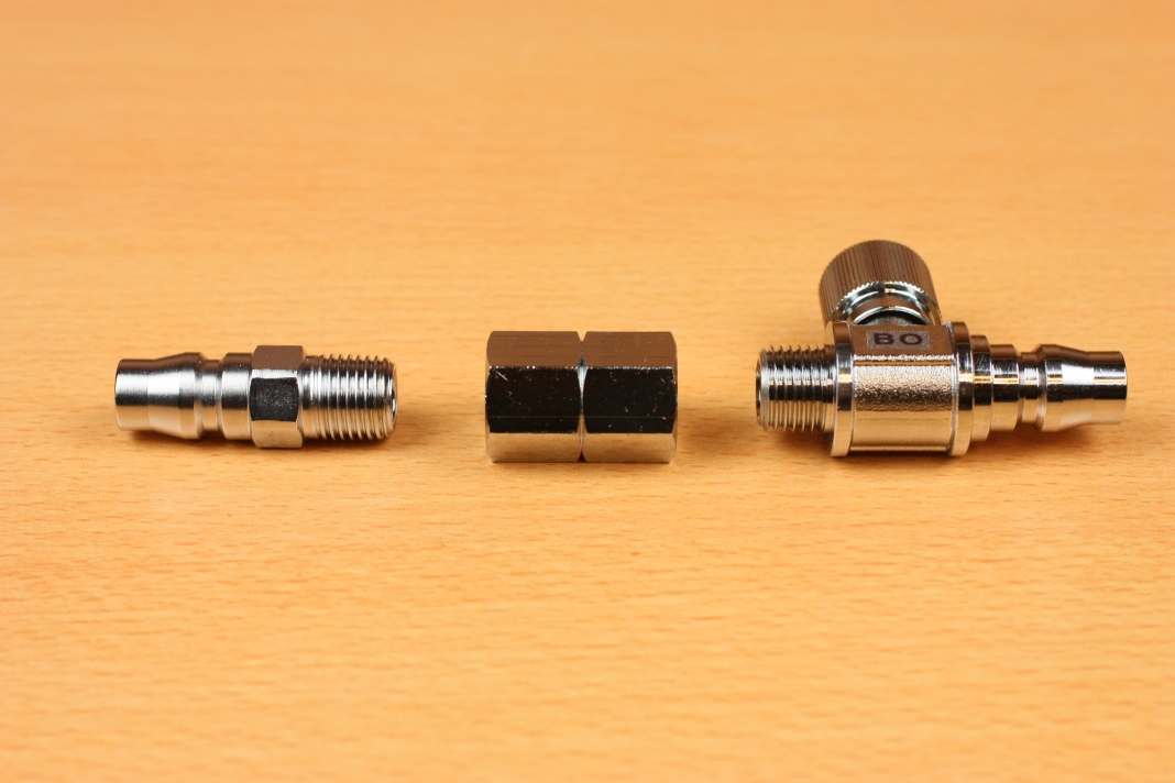 しかし、そのままだとコネクタの形状がメス-メスとなり接続できないため、今回のオス-オスのハイカプラーコネクタを作ったのですが、先ほど書いたとおりオスはバルブ機能がないので、バルブ機能を取り付けるためASOH エースボールエアーツール用(1/4)BO1200を取り付けています。