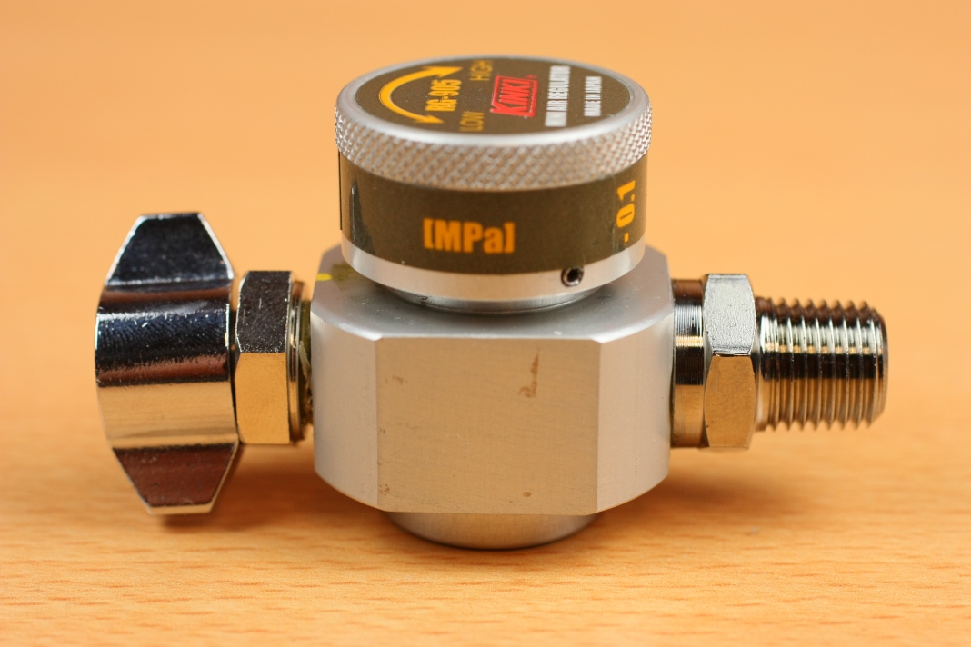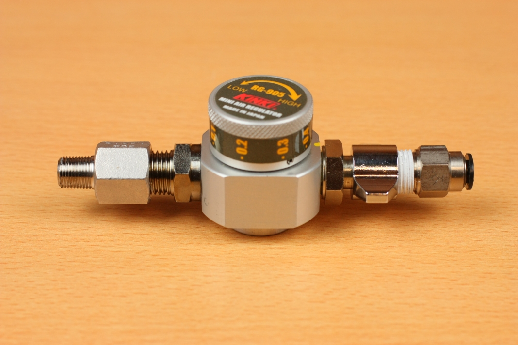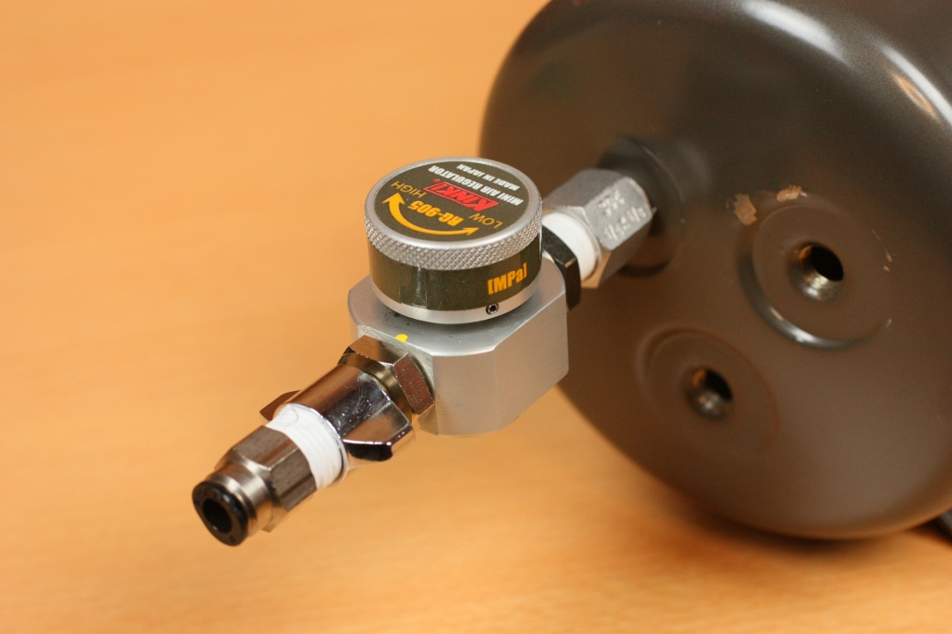 今回もレギュレーターには近畿製作所のRG-905Nを採用しました。最大圧力が0.5Mpa(実際は0.54Mpa出る)と低圧なので、ガスガンの初速が規制値を超えにくくなります。