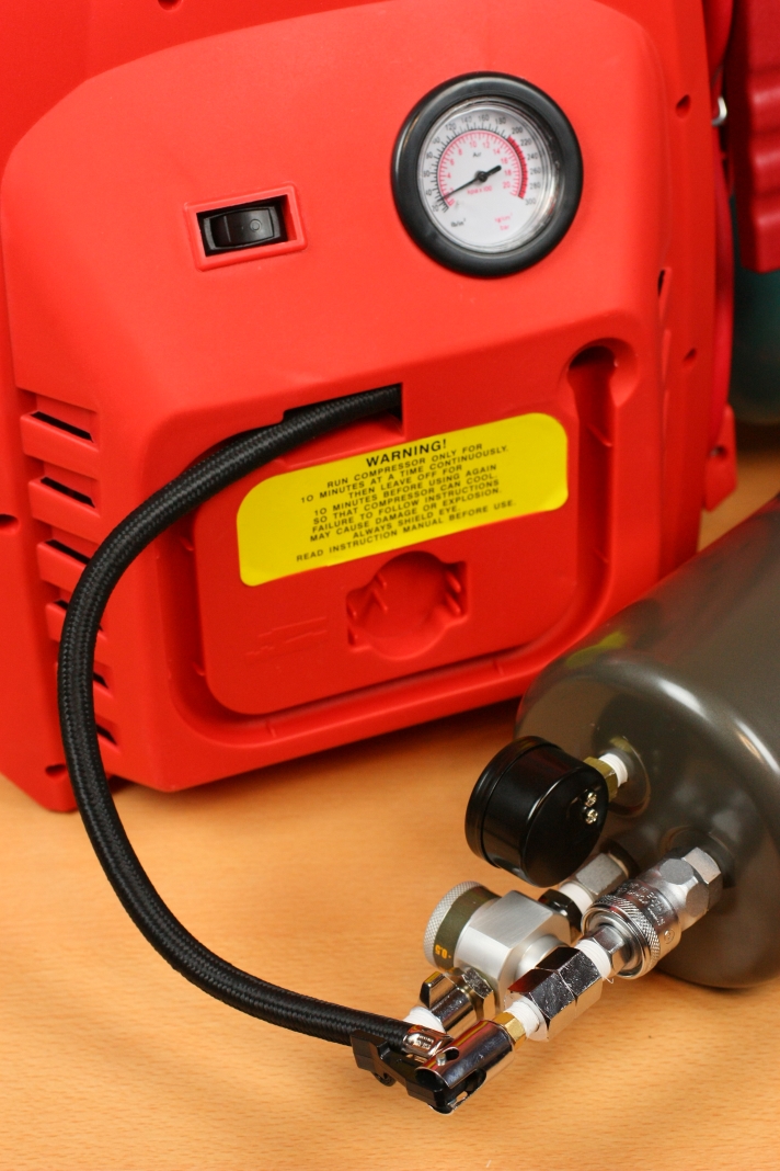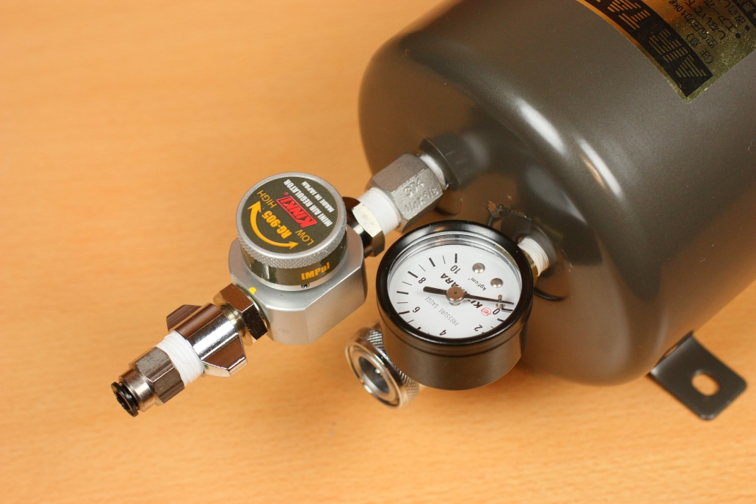 タンクへのエアー充填ですが、車のタイヤと同じバルブ形状のパーツがあるので、それをタンクに取付ければ充填できますよ。この記事で使用しているタンクはそのパーツが付いていますが、無い場合はPT-91等のパーツを流用するとで同じことができます。