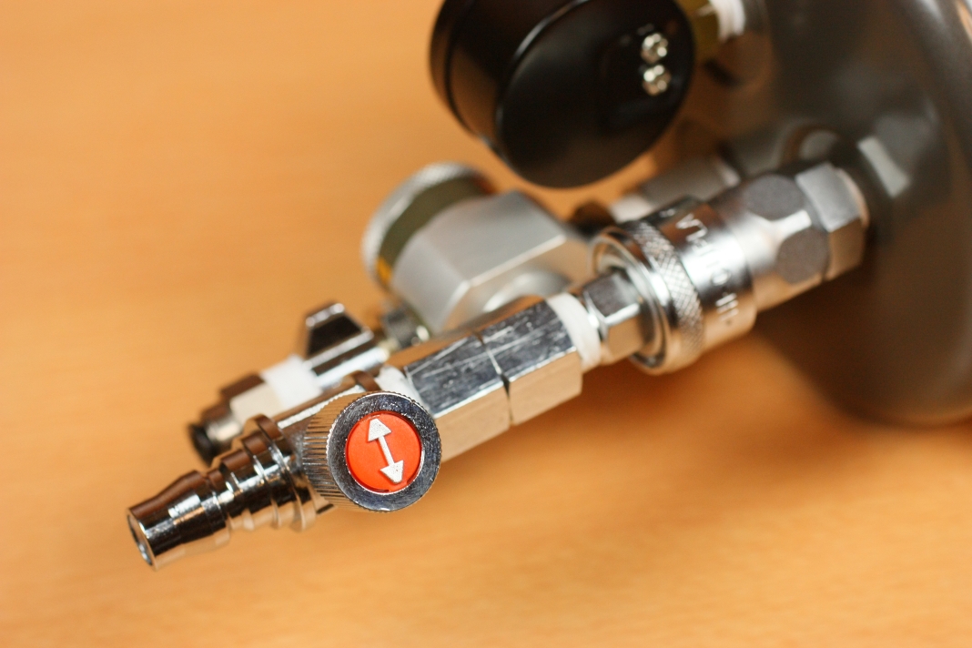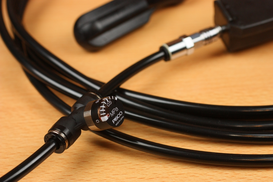 その前にこのPISCO GPU6-6を使用します。これは小型の圧力計で、ホースの間に挟むことでレギュレーターから出てきた2次圧力(吐出圧力)を計測することができます。
