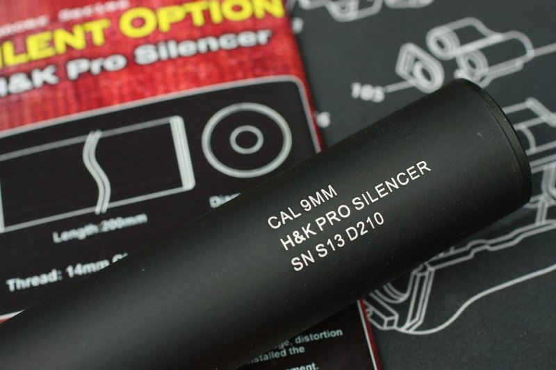 ものはH&K Pro Silencerで14mm正逆ネジ両対応で、サイズは長さ200mm・太さ35mmとなっています。