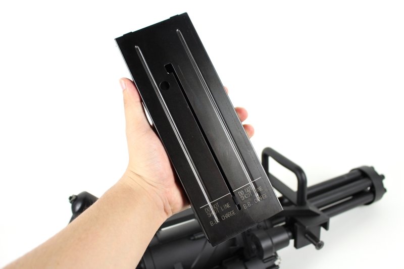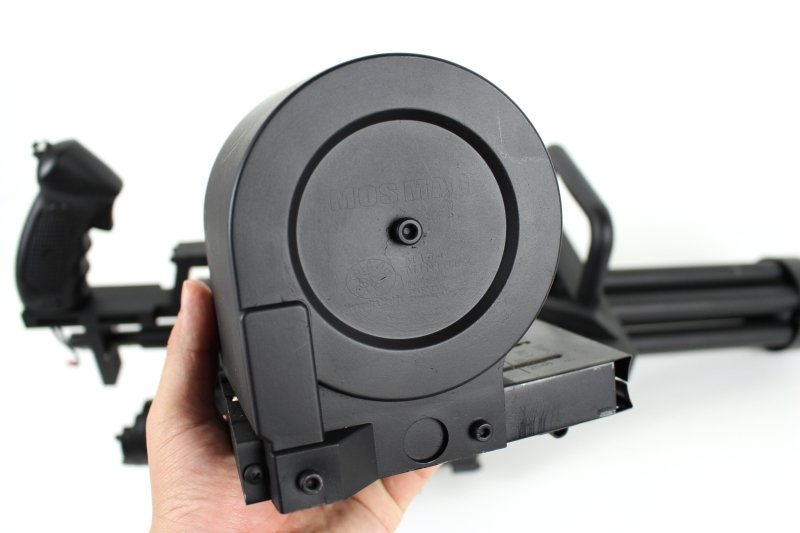 猛者の中にはこのマガジンを改良してる人もいるようですが、それほどBB弾の消費量が半端じゃないということです。ちょっと遊ぼうと思うと数千発が10分もせずに消えていくのがCAWのM134で、サバゲーで使うとなるとBB弾のコストだけでいったいどれだけ必要なのか皆目見当もつきません。