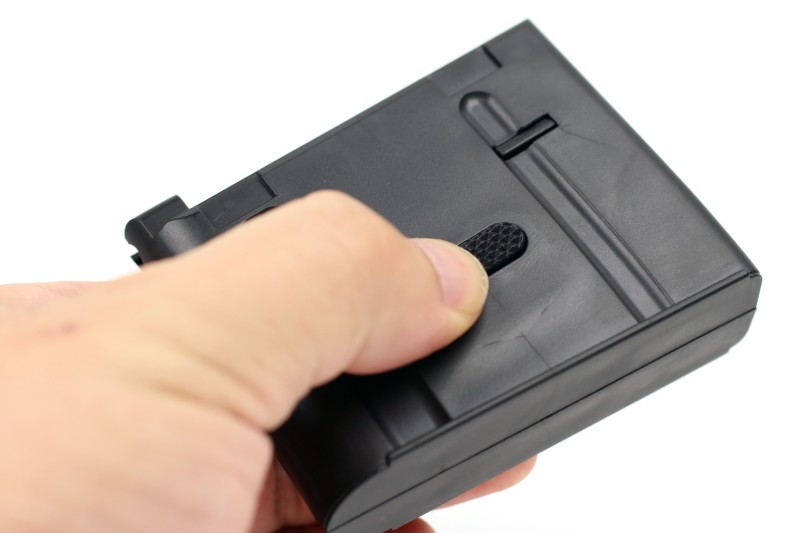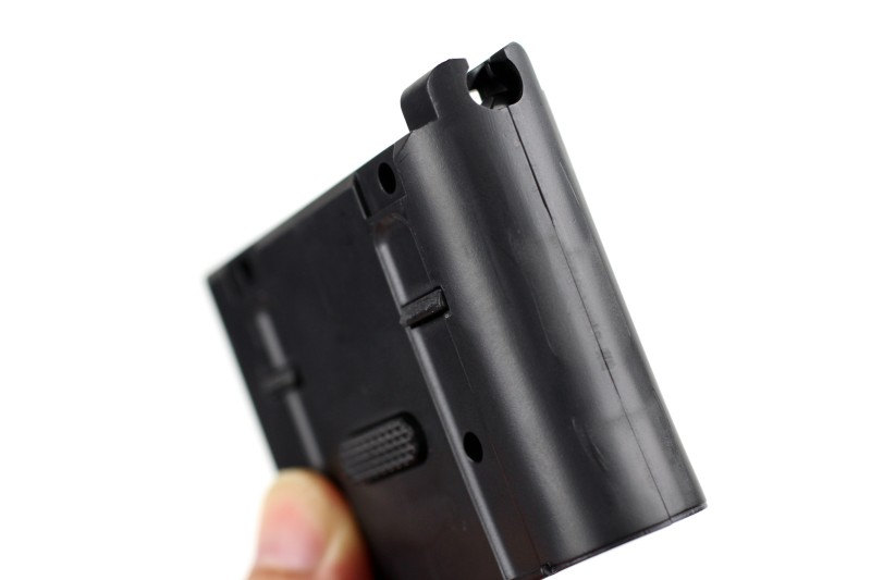 このマガジンの固定方法はショートタイプのものとは違い、マガジン内部のフレームにツメを引っかける構造になっており、マガジンのボタンを押すとツメが引っ込み抜けるようになります。