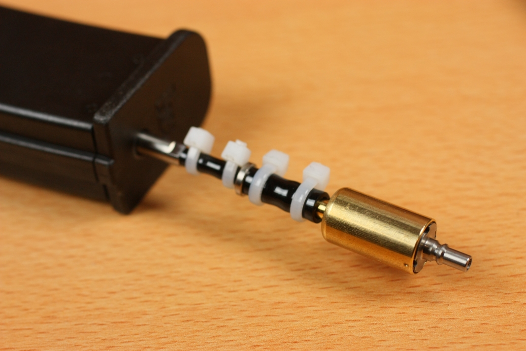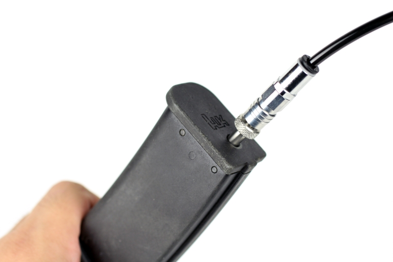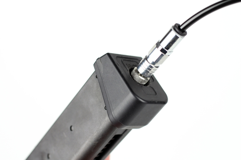 GLOCKシリーズ用ロングマガジンはバンパーがあるためマイクロカプラーのプラグ部分がバンパー内に埋没するため、手でカプラーを取り外すことができない状態です。