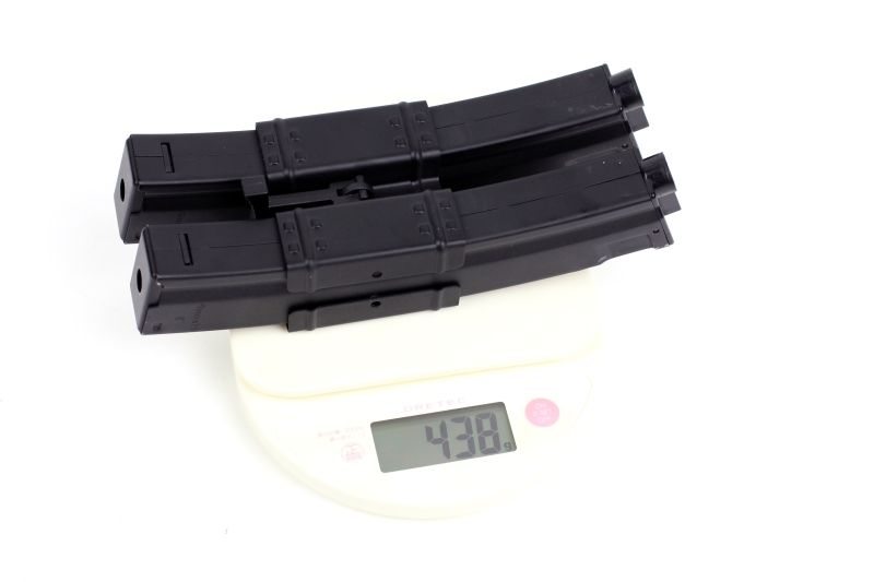試しに重量を量ってみたところ、マガジン2本とマルチダブルマガジンクリップで438gありました。