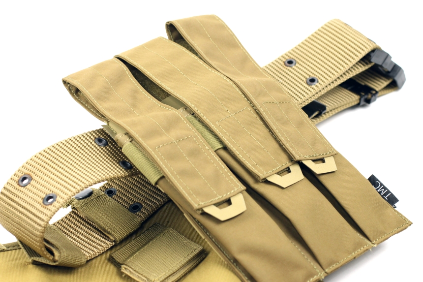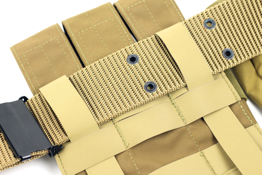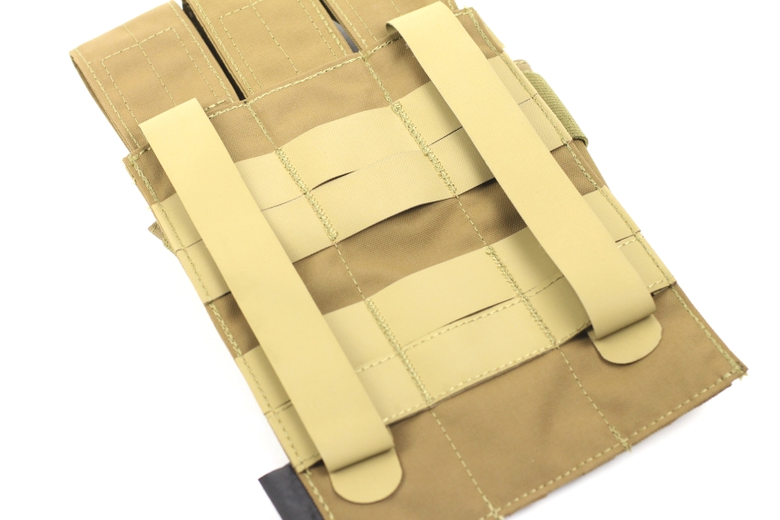 この、マガジンポーチはMOLLE規格に対応しており、背面にMOLLEウェービングに取り付けるためのベルトが用意されています。